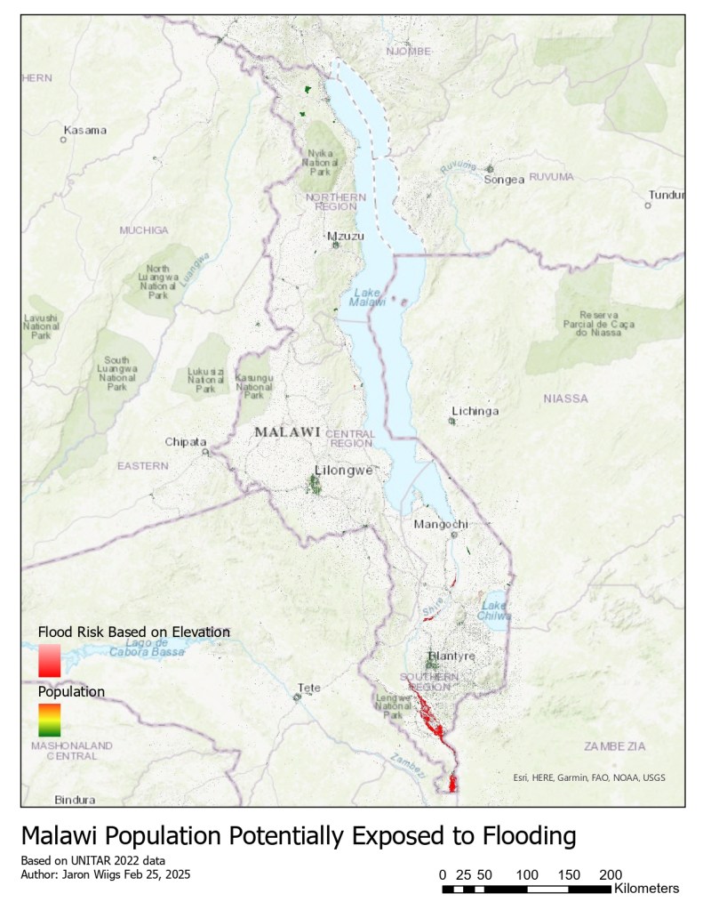 Beekon’s technology is most resilient against floods, so I compared Malawi’s elevation data, population density, and known flood zones to visualize which high density areas were most at risk of flooding in ArcGISpro.