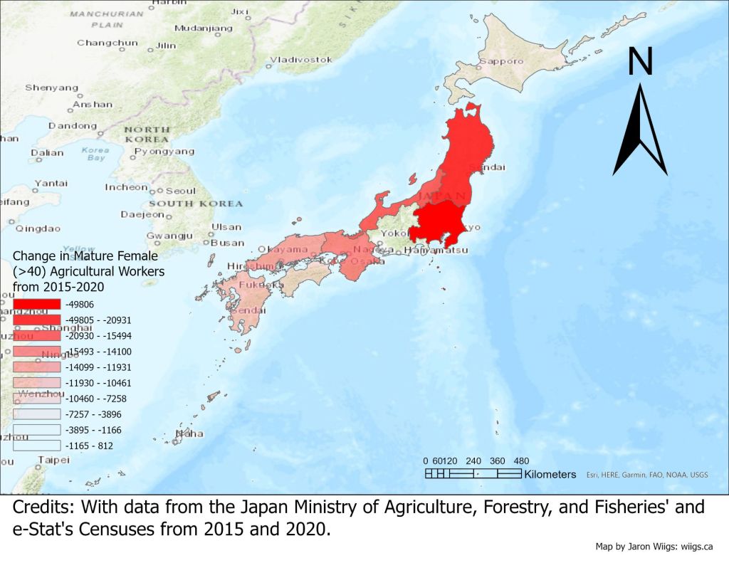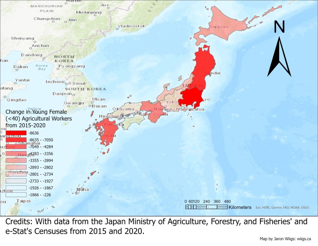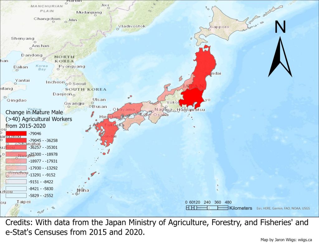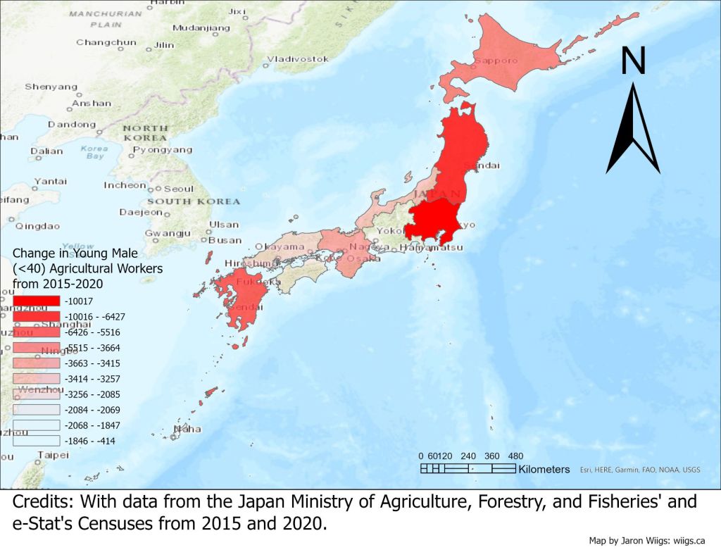 In beginning this project, I’ve decided to map out the change in young male workers (<40) engaged in agricultural work in the regions of Japan using data from the 2015 and 2020 Japan agricultural censuses. I would have liked to map more specifically by prefecture, but the 2015 data was only available by region. Perhaps when the 2025 data is released I will update these maps. The hard work of aggregating data on age and population of agricultural workers is done, so in the following days / weeks I will be posting more statistical maps, based on different analyses. This first phase of research will focus on how and why agricultural work is not popular among young Japanese folk.