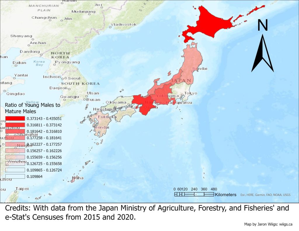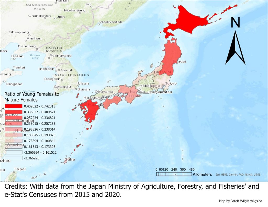We can see from these maps that the movement of men and women is not equal. There are some regions where more young women are leaving the agricultural sector and some where more young men are leaving. Hokkaido for example, saw a relatively stable mature agricultural population, but a very high proportion of those leaving the agricultural industry were young women and men. Moving south to Tohoku we see that the gross number for all age groups and genders leaving is high. Perhaps we can explore the reasons behind this later. Turning to Tohoku’s ratios we can see a comparatively high proportion of young men leaving, and a very high proportion of young women. Kanto experiences the same gross agricultural diminishing as Tohoku, likely due to consistent urbanisation. Kanto differs however, in it’s proportions of young to mature workers. Kanto’s ratio for young males leaving is on the lower side. This ratio is slightly higher for women, but is still not as significant as Tohoku. Moving on to Hokuriku, the changes overall were moderate, with the young female ratio looking quite weak only due to a large loss in mature female agricultural population. In Tokyo, agriculture seems to be alive and well, with relatively consistent mature male and female populations as well as relatively consistent young male populations. Tokai did experience a moderate loss of young female workers, which resulted in a similar ratio of young to mature female emigration as Hokuriku. Kinki was another worrying region, as the change in all demographics save for mature men was high. These maps have not been adjusted for population, which I will do at a later date, but the ratio maps did show worrying ratios of young Vs mature emigration for both men and women, with men being about on par with Hokkaido. Westwards towards Chugoku, we can see the changes in both young male and female agricultural populations become quite stable. This is contrasted by a relatively large decrease in the mature population of both genders. As a result, the ratio maps look quite light here. Shikoku was a very similar outcome, but the ratio of young women to mature women was higher. Kyushu saw high losses in all demographics, but the rate at which they lost young female workers was relatively high. Finally coming to Okinawa, overall losses were quite small, likely due to an overall smaller population. The ratios for losses of young men were about on par with Kyushu, and for women very similar to Hokuriku. Through investigating these maps, I have learned more than I initially thought I would. I will likely investigate patterns of immigration to cities and various other population statistics next. This initial look has sparked many questions, and I feel confident that continued efforts will yield interesting results. I hope you found this research interesting. Until next time!