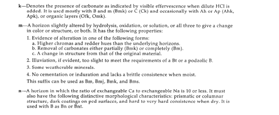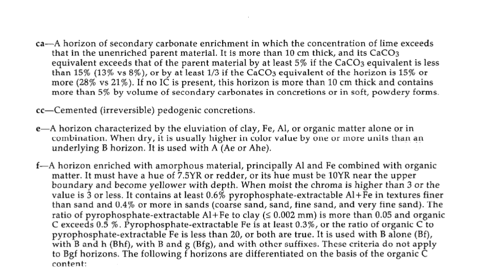 In Canada’s system, the closest thing we have to classifying soil chemical properties in the field is the lowercase horizon suffix k, denoting the presence of carbonates, which hints at eluviation processes acting on the soil, as well as a glacial till parent material.
