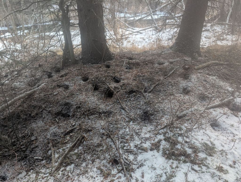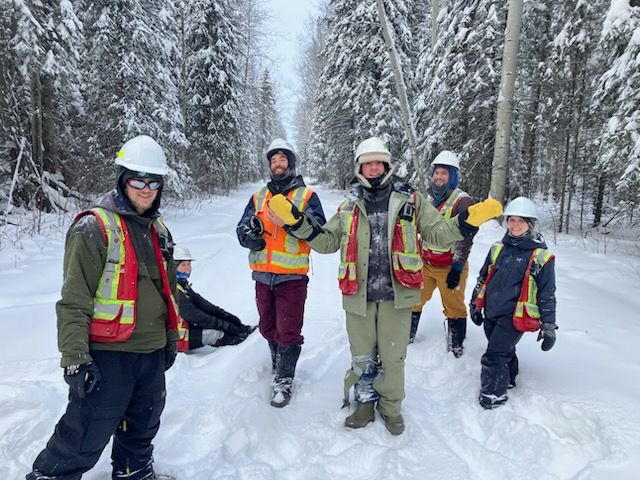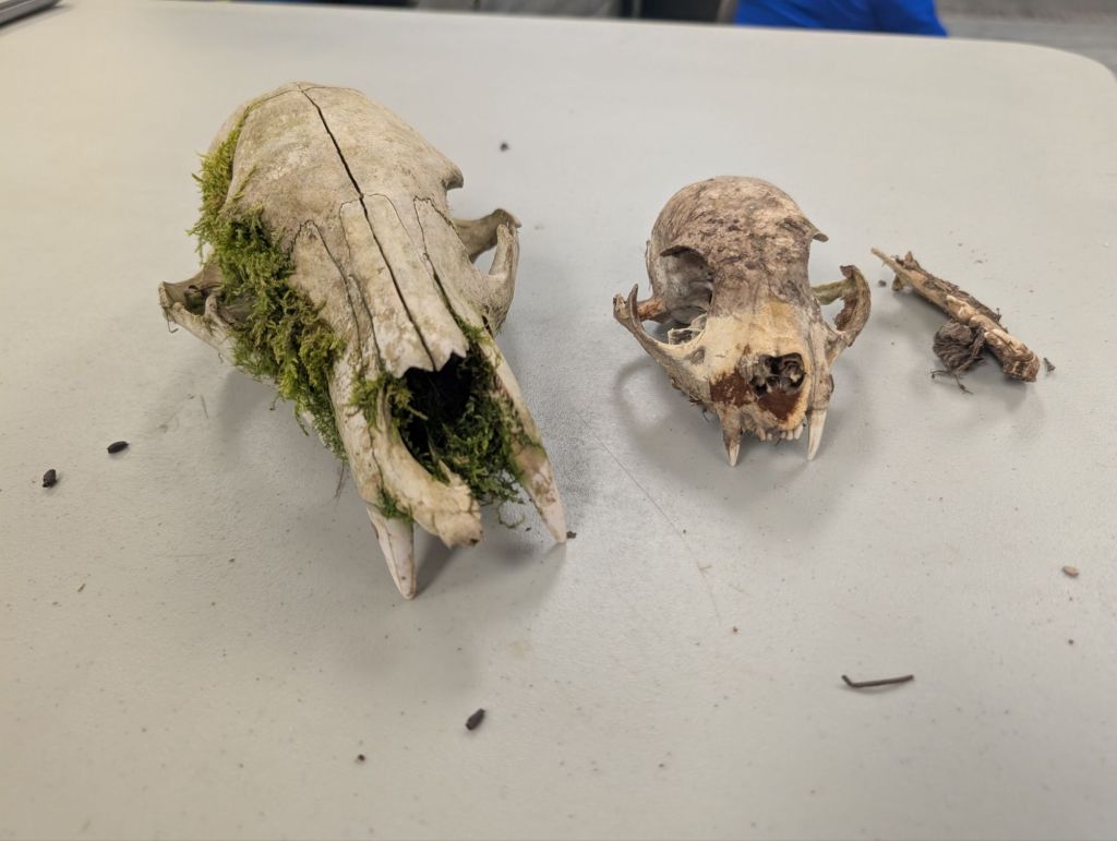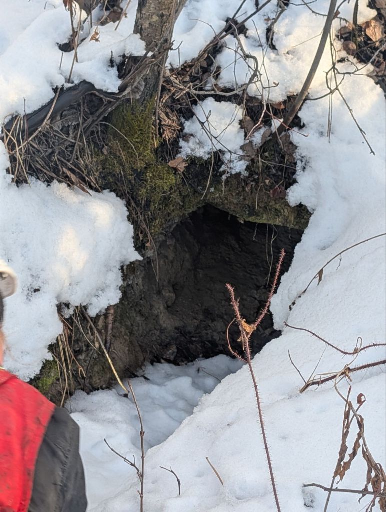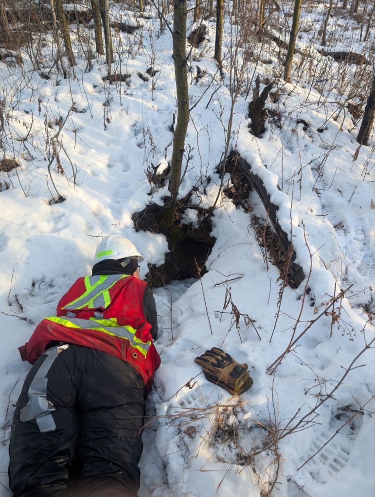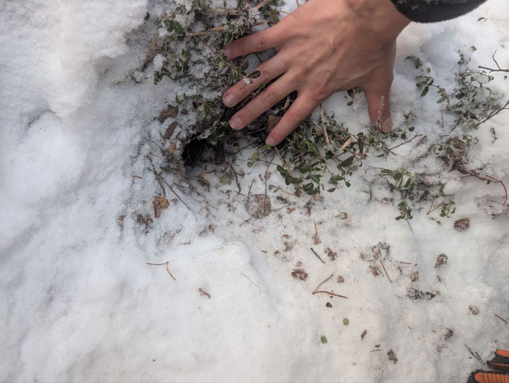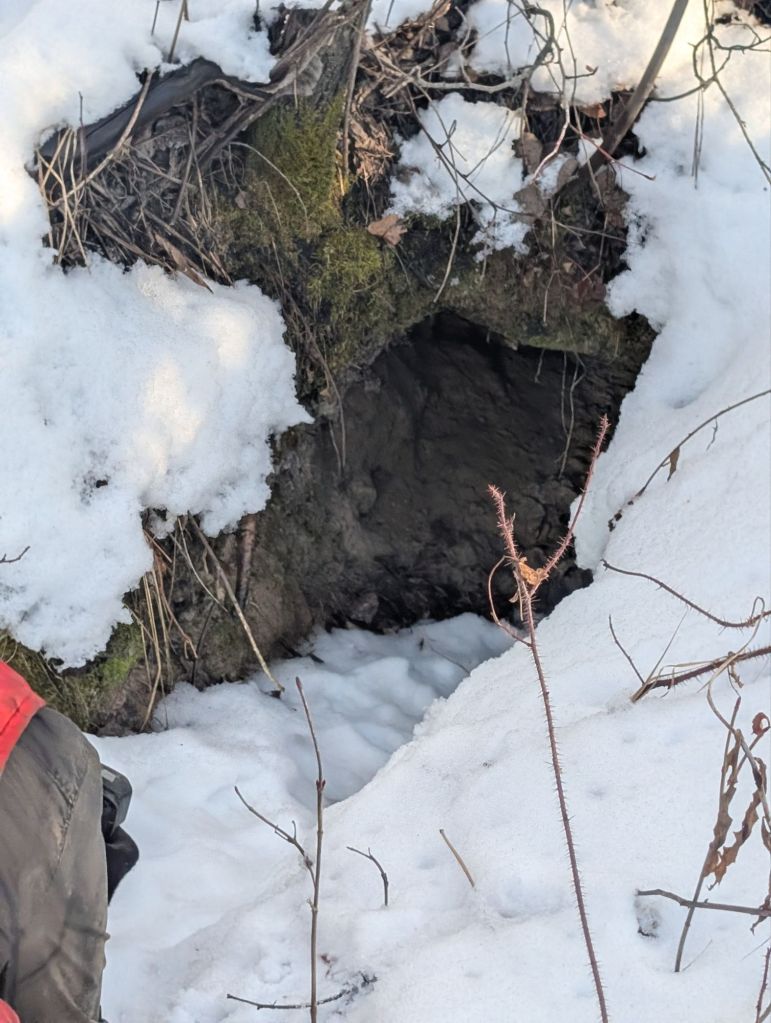 In these sweeps, we found a black bear hibernation den, active beaver lodges, an otter den, ravens, grouse, snowshoe hares, many different small birds, and squirrels. We also saw many undulate tracks.